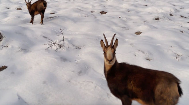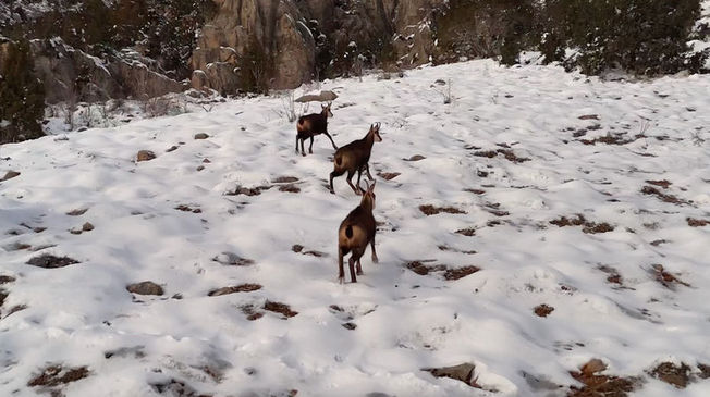 3 bin 300 metre rakımda karlı arazide bir süre beslenen keçiler, daha sonra gözden kayboldu.