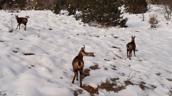 Uluslararası Doğayı Koruma Birliği'nin nesli tükenme tehlikesi altında olan türlerde kırmızı listede yer alan 'Şamua' olarak da bilinen çengel boynuzlu dağ keçilerini görüntüleyen Yeter, bir süre hareketlerini takip etti.