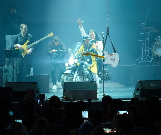 Sahneye motosikletle giriş yapan ünlü şarkıcı, yukarıdan indirilen gitarıyla konsere başladı. Sahne şovuyla göz dolduran Murat Kekilli, farklı bir görsel şölene imza attı.
