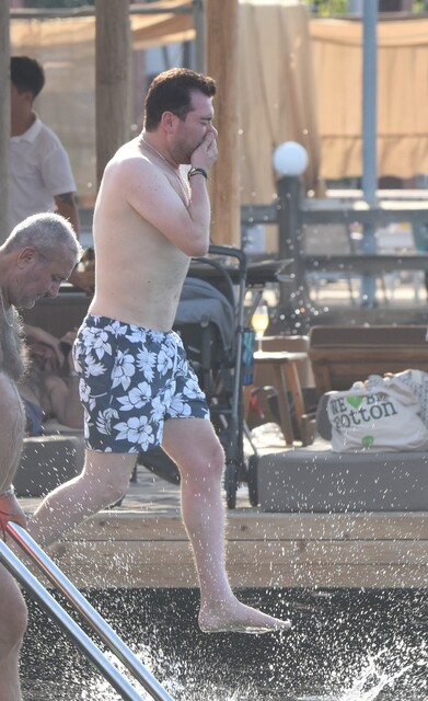 Eşi Asena Toprak ile Bodrum'da tatil yapan Murat Kurşun, bir plajda lahmacun yerken görüntülendi