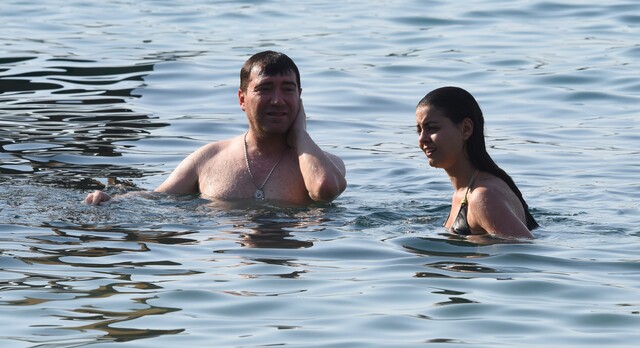 Ege'nin serin sularında serinleyen çift, bir süre yüzdükten sonra denizden çıktı.