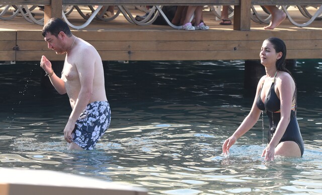 Murat Kurşun, karnını doyurduktan sonra eşiyle birlikte iskeleden denize atladı.