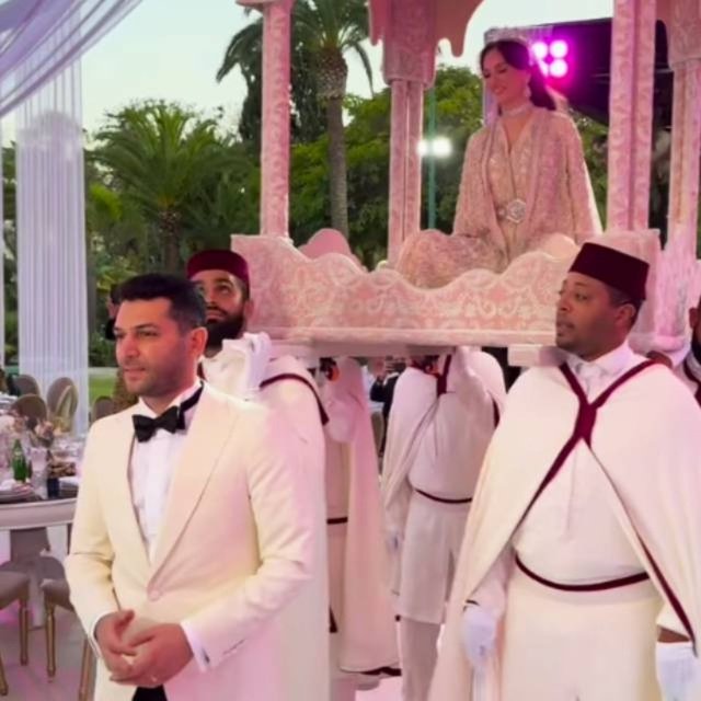Düğünde Iman Elbani, yöresel kıyafetleriyle taht içinde mekâna gelirken oyuncu da danslarıyla ona eşlik etti.
