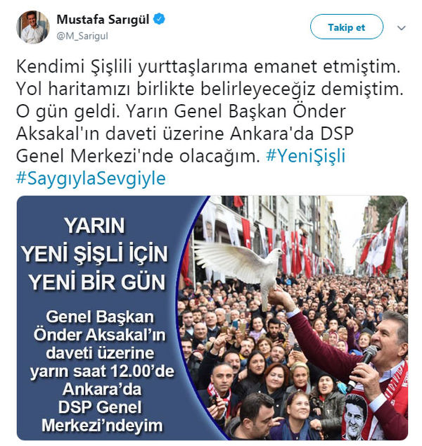Sarıgül, "Kendimi Şişlili yurttaşlarıma emanet etmiştim. Yol haritamızı birlikte belirleyeceğiz demiştim. O gün geldi. Yarın Genel Başkan Önder Aksakal'ın daveti üzerine Ankara'da DSP Genel Merkezi'nde olacağım" dedi.