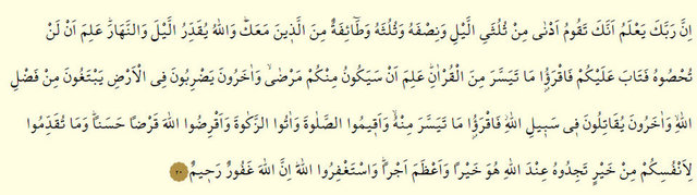 20.İnne rabbeke ya'lemu enneke tekumu edna min suluseyilleyli ve nısfehu ve sulusehu ve taifetun minelleziyne me'ake vallahu yukaddirulleyle vennehare 'alime en len tuhsuhu fetabe 'aleykum fakreu ma teyessere minelkur'ani 'alime en seyekunu minkum merda ve aharune yadribune fiyl'ardı yebteğune min fadlillahi ve aharune yukatilune fiy sebiylillahi fakreu ma teyessere minhu ve ekıymussalate ve atuzzekate ve akridullahe kardan hasenen ve ma tukaddimu lienfusikum min hayrin teciduhu 'ındallahi huve hayren ve a'zame ecren vestağfirullahe innallahe ğafurun rahıymun.