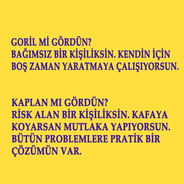 Bu soruda aslında bir doğru ya da yanlış yok. Görüş şeklimiz, kişilik özelliklerimizle ilgili ufak detayları ortaya çıkarıyor. Gördüğün hayvana göre kişilik özelliğini aşağıda bulabilirsin.