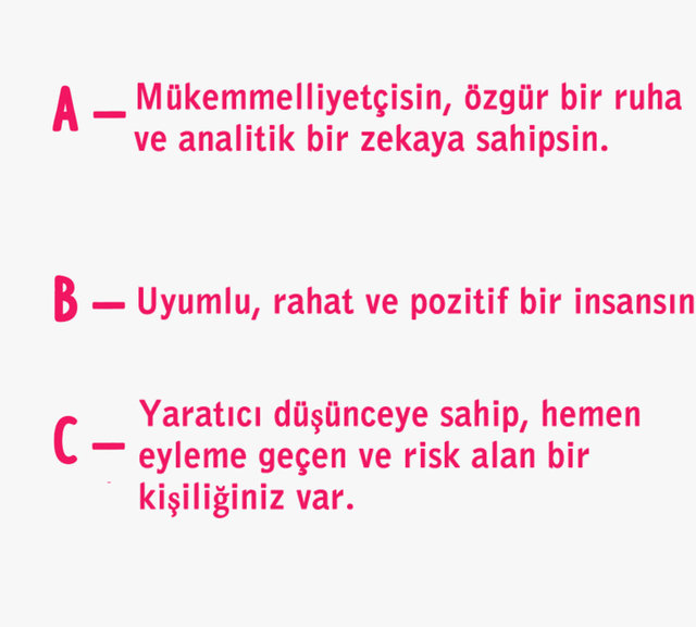 Bu soruda aslında bir doğru ya da yanlış yok. Görüş şeklimiz, kişilik özelliklerimizle ilgili ufak detayları ortaya çıkarıyor. Gördüğün şekle göre kişilik özelliğini aşağıda bulabilirsin.