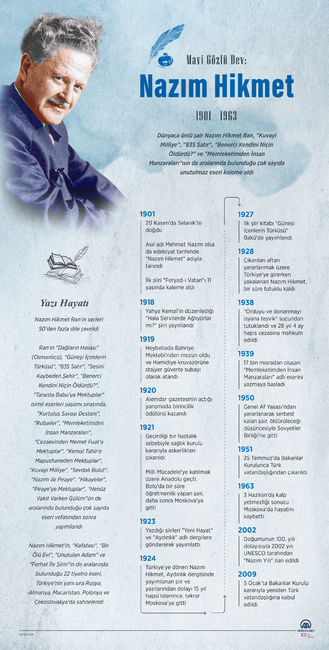 "Kuvayi Milliye", "835 Satır", "Benerci Kendini Niçin Öldürdü?" ve "Memleketimden İnsan Manzaraları"nın da aralarında bulunduğu çok sayıda unutulmaz eseri kaleme alan, dünyaca ünlü şair Nazım Hikmet Ran, vefatının 57. yılında anılıyor. Biz de sizler için Usta edebiyatçı Nazım Hikmet Ran'ın hayatını ve unutulmaz sözlerini sizler için hazırladık...