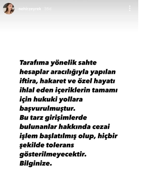 "Tarafıma yönelik sahte hesaplar aracılığıyla yapılan iftira, hakaret ve özel hayatı ihlal eden içeriklerin tamamı için hukuki yollara başvurulmuştur. Bu tarz girişimlerde bulunanlar hakkında cezai işlem başlatılmış olup, hiçbir şekilde tolerans gösterilmeyecektir. Bilginize"