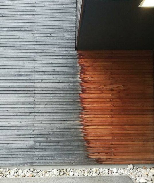 Dış cephede aynı ahşap kullanılmış fakat yağmur, güneş, kar gibi hava olayları 10 yılda sol kısmı soldururken, üstü kapalı olduğu için sağ taraf rengini koruyabilmiş.