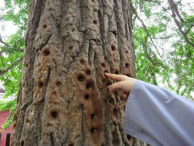 Shaolin rahiplerinin parmaklarını güçlendirmek için ağaç gövdesine bastırarak oluşturdukları delikler.