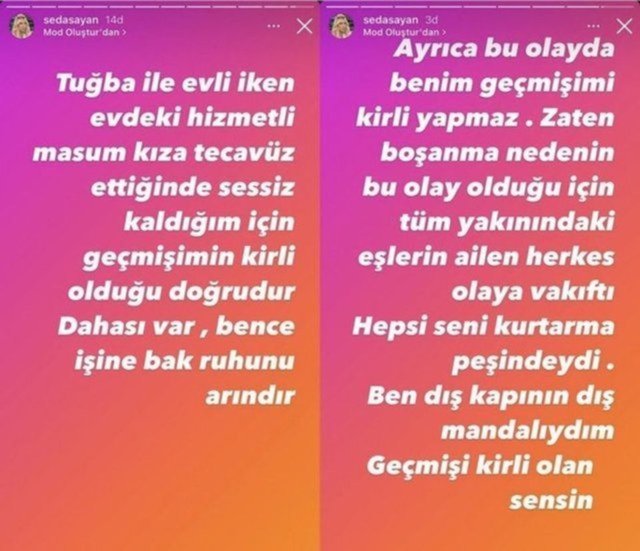 Sayan, "Tuğba ile evliyken evdeki hizmetli masum kıza tecavüz ettiğinde sessiz kaldığım için geçmişimin kirli olduğu doğrudur. Ayrıca bu olay da benim geçmişimi kirli yapmaz. Zaten boşanma nedenin bu olay olduğu için tüm yakınındaki eşlerin ailen herkes olaya vakıftı. Hepsi seni kurtarma peşindeydi. Ben dış kapının dış mandalıydım. Geçmişi kirli olan sensin. Bence işine bak, ruhunu arındır. Dua et çocuklarının hatırına. Allah'tan af dile benden değil" demişti.