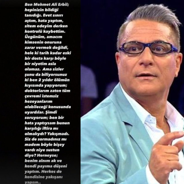 Ben Mehmet Ali Erbil; hepinizin bildiği, tanıdığı... Evet, sınırı aştım, hata yaptım, sitem edeyim derken kontolü kaybettim. Üzgünüm, amacım kimsenin onuruna zarar vermek değildi. Hele ki tarih kadar eski bir dosta karşı böyle bir niyetim asla olamaz ama sizler şunu da biliyorsunuz ki; ben 2 yıldır ölümün kıyısında yaşıyorum. Doktorlarım zaten tüm çevremi istemsiz hezeyanları olabileceğim konusunda uyardılar. Şimdi soruyorum; ben bir hata yaptıysam bunun karşılığı iftira mı olmalıydı? Yakışmadı. Siz de sormadınız mı 'Madem böyle bir şey vardı, niye sustun' diye? Her neyse; benim alnım ak ve kendi payıma düşeni yaptım. Herkes de kendisine yakışanı yapsın.