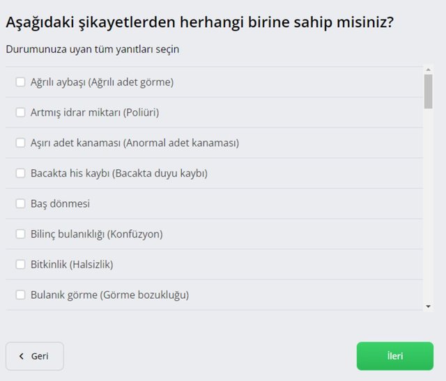 Ardından sistem, kişideki diğer şikayetleri kontrol etmek amacıyla bir liste sunuyor.