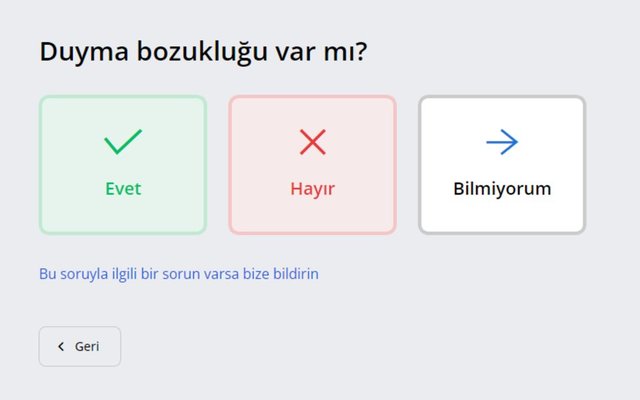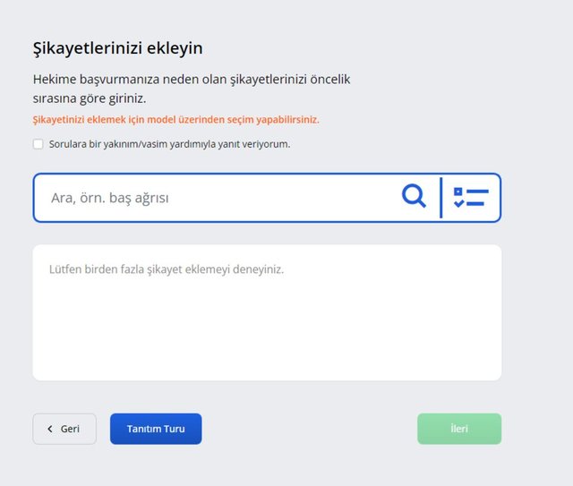 Listeden seçtiğiniz şikayete göre "evet", "hayır" veya "bilmiyorum" şeklinde cevaplanabilecek ve muhtemel teşhise yardımcı olabilecek birtakım soruların yanıtlanması gerekiyor.