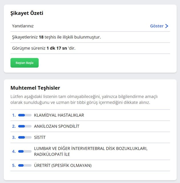 Soruların tamamlanmasıyla ekrana "şikayet özeti" ve "muhtemel teşhisler" olmak üzere iki farklı başlıkta sonuçlar geliyor. Böylece vatandaşlar, şikayetlere dair muhtemel bir sonuç elde edebildiği gibi doğru branşlara yönlendiriliyor.