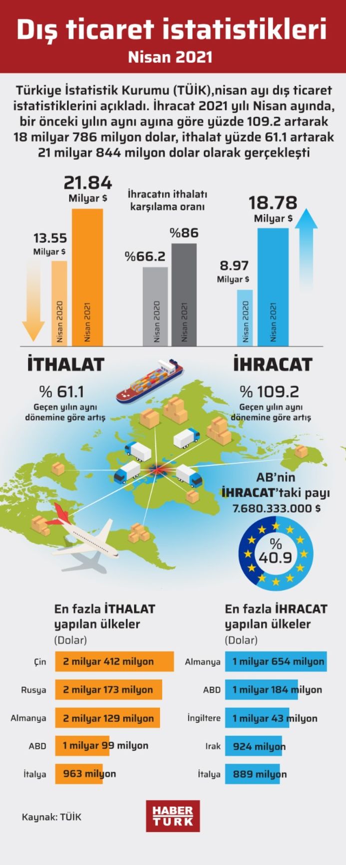 Türkiye İstatistik Kurumu ile Ticaret Bakanlığı işbirliğiyle oluşturulan genel ticaret sistemi kapsamında üretilen geçici dış ticaret verilerine göre; ihracat 2021 yılı Nisan ayında, bir önceki yılın aynı ayına göre %109,2 artarak 18 milyar 786 milyon dolar, ithalat %61,1 artarak 21 milyar 844 milyon dolar olarak gerçekleşti.