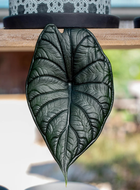 Alocasia Ejderha Pulu bitkisinin yaprakları aynı deri koltuk yapısında duruyor, çok tuhaf değil mi sizce de?''