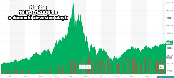 Bundan tam 20 yıl önce, 10 Mart 2000'de, Nasdaq 5 bin 132 puanla gün içi, 5 bin 48 puanla ise o dönemki kapanış rekorunu kırdı. 10 Mart 2000 itibarıyla Nasdaq 2000 yılı genelinde yüzde 24 yükselmişti. Endeksteki 5 yıllık yükseliş ise yüzde 525'i bulmuştu.