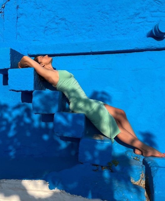 Daha önce mavi mayosuyla poz veren Nurgül Yeşilçay, bu kez turkuaz renkli elbisesiyle objektif karşısına geçti. Merdivenlere uzanan oyuncu, "Tatil devam tabii ki" dedi.