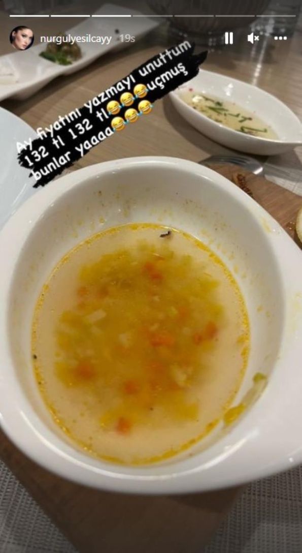 Çorbanın fotoğrafını yayınlayan Nurgül Yeşilçay, gönderisine "Ay öyle bir yerdeyiz ki of çok iyi. Çorba ölmeden önce. Ay fiyatını yazmayı unutmuşum 132 TL. Uçmuş bunlar ya!" ifadelerini not düştü.
