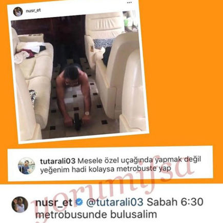Nusret'in videosuna takipçilerinden biri, 'Mesele özel uçağında yapmak değil yeğenim, hadi kolaysa metrobüste yap' yazdı. Ünlü etçinin takipçisine yanıtı gecikmedi: Sabah 06.30 metrobüsünde buluşalım.