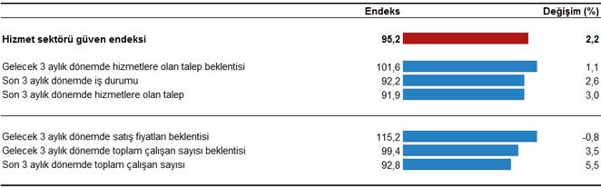 Mevsim etkilerinden arındırılmış hizmet sektörü güven endeksi Aralık ayında 93,2 iken, Ocak ayında %2,2 oranında artarak 95,2 değerini aldı. Hizmet sektöründe bir önceki aya göre, gelecek üç aylık dönemde hizmetlere olan talep beklentisi endeksi %1,1 artarak 101,6 oldu. Son üç aylık dönemde iş durumu endeksi %2,6 artışla 92,2 değerini aldı. Son üç aylık dönemde hizmetlere olan talep endeksi ise %3 artarak 91,9 oldu.