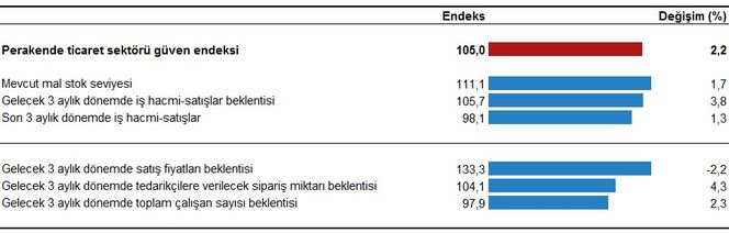 Mevsim etkilerinden arındırılmış perakende ticaret sektörü güven endeksi Ocak ayında %2,2 oranında artarak 105 değerini aldı. Perakende ticaret sektöründe bir önceki aya göre, mevcut mal stok seviyesi endeksi %1,7 artarak 111,1 oldu. Gelecek üç aylık dönemde iş hacmi-satışlar beklentisi endeksi %3,8 artarak 105,7 değerini, son üç aylık dönemde iş hacmi satışlar endeksi ise %1,3 artarak 98,1 değerini aldı.