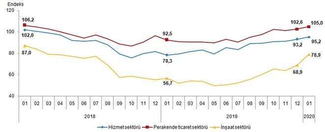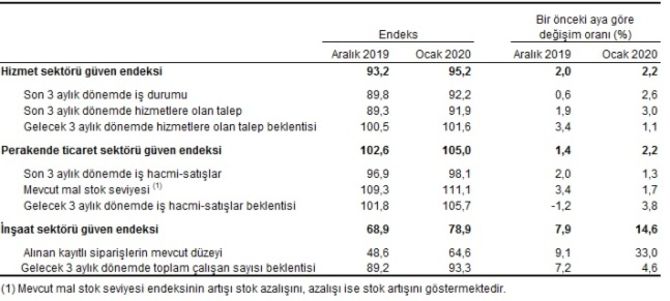 Türkiye İstatistik Kurumu (TÜİK), 2020 Ocak ayı Sektörel Güven Endeksleri'ni açıkladı. Güven endeksi Ocak ayında bir önceki aya göre; hizmet ve perakende ticaret sektörlerinde yüzde 2,2, inşaat sektöründe ise yüzde 14,6 arttı.