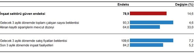 Mevsim etkilerinden arındırılmış inşaat sektörü güven endeksi bir önceki ayda 68,9 iken, Ocak ayında %14,6 oranında artarak 78,9 değerini aldı. İnşaat sektöründe bir önceki aya göre, gelecek üç aylık dönemde toplam çalışan sayısı beklentisi endeksi %4,6 artarak 93,3 oldu. Alınan kayıtlı siparişlerin mevcut düzeyi endeksi ise %33 artışla 64,6 değerini aldı.