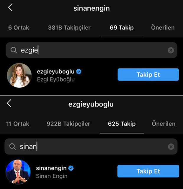 Geçtiğimiz aylarda da çiftin aşkında yeni bir gelişme yaşanmıştı. Ezgi Eyüboğlu, sevgilisinin babası Sinan Engin ile sosyal medyada takipleşmeye başlamıştı.