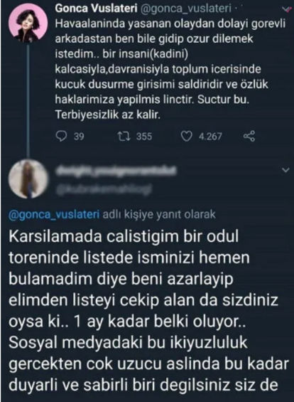 İstanbul Havalimanı'nda bir çalışana hakaret eden Funda E.'ye tepki gösteren oyuncu Gonca Vuslateri'ye bir takipçisinden, "Karşılamada çalıştığım bir ödül töreninde listede isminizi hemen bulamadım diye beni azarlayıp elimden listeyi çekip alan da sizdiniz oysa ki.. 1 ay kadar belki oluyor... Sosyal medyadaki bu ikiyüzlülük gerçekten çok üzücü. Aslında bu kadar duyarlı ve sabırlı biri değilsiniz siz de" şeklinde bir eleştiri mesajı gelmişti.