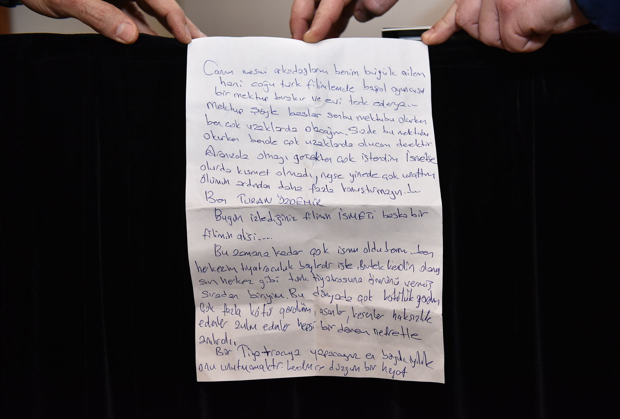Konuşmaların ardından Turan Özdemir’in hayattayken yazdığı bir mektup, konukların ve basın mensuplarının önünde ilk kez okundu. Radyo programcısı Hüseyin Özdemir’in okuduğu mektupta; “Canım mesai arkadaşlarım, benim büyük ailem. Hani çoğu Türk filmlerinde başrol oyuncusu bir mektup bırakır ve evi terk eder ya. Siz de bu mektubu okurken ben çok uzaklarda olacağım. Aranızda olmayı gerçekten çok isterdim. ‘İsmetse Olur’da kısmet olmadı maalesef. Bu dünyada çok kötülük gördüm, çok fazla kötü gördüm. Zulüm edenler her zaman nefretle anıldı. Bir tiyatrocuya yapacağınız en büyük iyilik, onu unutmamaktır. Kendimce düzgün bir hayat sürdüm ama eski enerjim de kalmadı. Kalbim artık yeter demeye başladı. Kendimi hasta hissediyorum. Farz edin ki aranızda değilim ama ben her yerdeyim. Hepinizden tek bir isteğim var. Sakın beni unutmayın” cümleleri yazıyordu. Mektubun okunmasıyla duygusal anlar yaşanırken, sonrasında salona geçen konuklar usta sanatçıyı beyaz perdede izleyerek alkış yağmuruna tuttu.