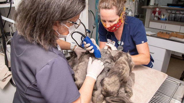 Çalışanlara göre kedinin tüyleri keçe haline gelmişti ve kediyi tüylerinden arındırmak yaklaşık bir saat sürdü.