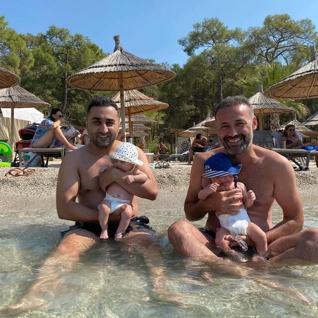 Her yıl aynı yerde buluşan Onur Buldu ve Aziz Aslan, çocuklarıyla birlikte plajda fotoğraf çektiriyor.
