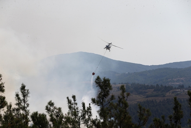 Dün havanın kararmasının ardından çalışmalara ara veren söndürme helikopterleri, sabahın ilk ışıklarıyla müdahaleye yeniden başladı.