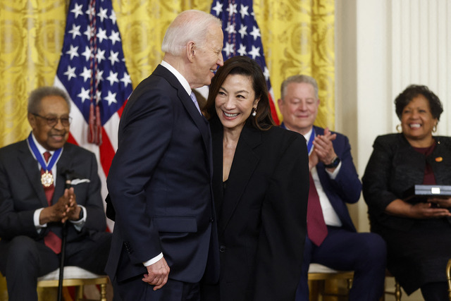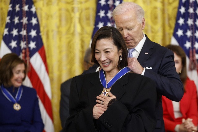 Joe Biden; "Dövüş sanatlarından romantik komedilere, bilim kurguya kadar hepimizin ortak noktasını gösterdi. En İyi Kadın Oyuncu dalında Oscar kazanan ilk Asyalı oyuncu olarak, yalnızca eğlendirmek için değil, aynı zamanda ilham vermek ve kalpleri açmak için de kültürler arasında köprü kuruyor ve yapmaya devam ediyor" sözlerinin ardından Yeoh'a madalyasını taktı.