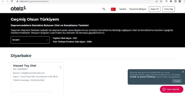 Deprem felaketi nedeniyle, depremzedelerin barınma ihtiyaçlarının karşılanmasına yönelik internet üzerinden de 'https://www.otelz.com/tr/gecmisolsunturkiyem' isimli internet sitesi oluşturuldu. Özellikle deprem bölgesindeki iller ve yakın çevresindeki oteller olmak üzere Türkiye genelinde çok sayıda otel, depremzedelere ücretsiz konaklama hizmeti vermek için internet sitesine üye oldu. Site üzerinde ücretsiz hizmet verecek oteller isimleriyle yer alıyor. İnternet sitesine kısa sürede 200'ün üzerinde otel ücretsiz barınma imkanı sunmak için üyelik oluşturdu ve ayrılan oda sayısı da 1000'i aştı. İnternet sitesinde kampanyaya katılan tüm oteller illere göre sıralanıyor.