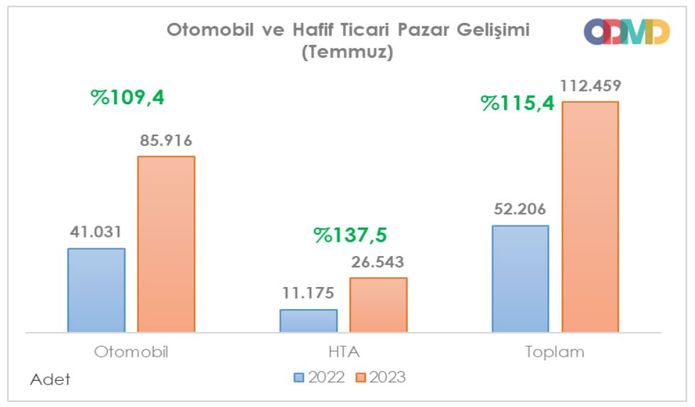 ODMD'nin açıkladığı rakamlara göre, Temmuz ayında Türkiye otomobil ve hafif ticari araç pazarı 2022 yılı Temmuz ayına göre yüzde 115.4 büyüdü ve 112 bin 459 seviyesine çıktı.