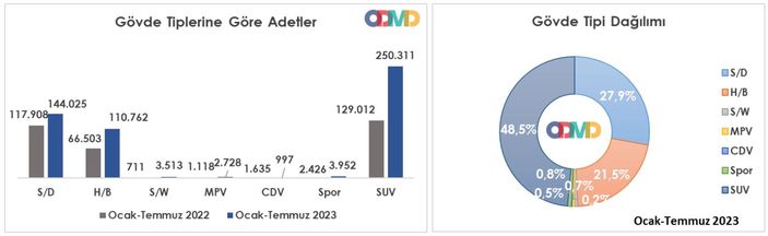 Otomobil pazarı gövde tiplerine göre değerlendirildiğinde ise en çok tercih edilen gövde tipi yüzde 48.5 payla yine SUV otomobiller oldu.