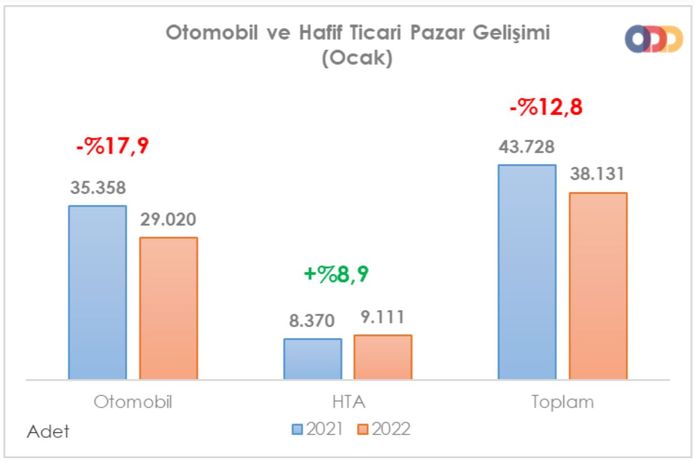 Otomotiv Distribütörleri Derneği (ODD) verilerine göre, yılın ilk ayında otomobil satışları, 2022 yılı Ocak ayında geçen yılın aynı ayına göre yüzde 17.9 oranında azalarak 29 bin 20 adet olurken, hafif ticari araç pazarı da yüzde 8.9 artarak 9 bin 111 adede ulaştı.