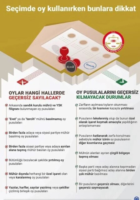 - Zarftan çıkan oy pusulalarında bir seçim türüne ait olanının geçersiz olması, diğerinin geçersiz sayılmasını gerektirmeyecek.
