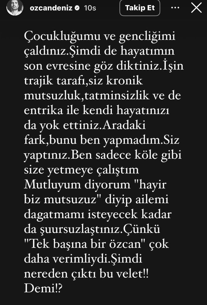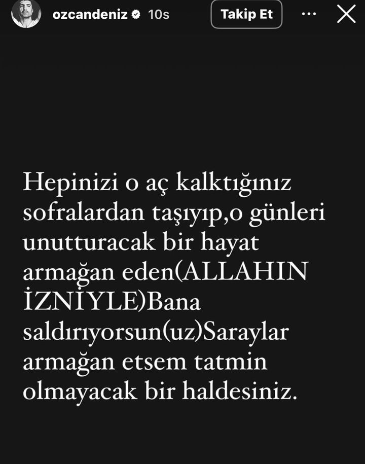Peş peşe sitemkâr paylaşımlarda bulunan Özcan Deniz, şu ifadeleri kullandı; "Hepinizi o aç kalktığınız sofralardan taşıyıp, o günleri unutturacak bir hayat armağan eden (Allah'ın izniyle) bana saldırıyorsunuz. Saraylar armağan etsem tatmin olmayacak bir haldesiniz.