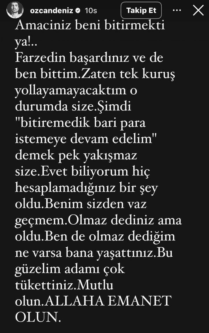 Amacınız beni bitirmekti ya... Farz edin başardınız ve de ben bittim. Zaten tek kuruş yollayamayacaktım o durumda size. Şimdi 'Bitiremedik bari para istemeye devam edelim' demek pek yakışmaz size. Evet biliyorum hiç hesaplamadığınız bir şey oldu. Benim sizden vazgeçmem. 'Olmaz' dediniz ama oldu. Ben de olmaz dediğim ne varsa bana yaşattınız. Bu güzelim adamı çok tükettiniz. Mutlu olun. Allah'a emanet olun."