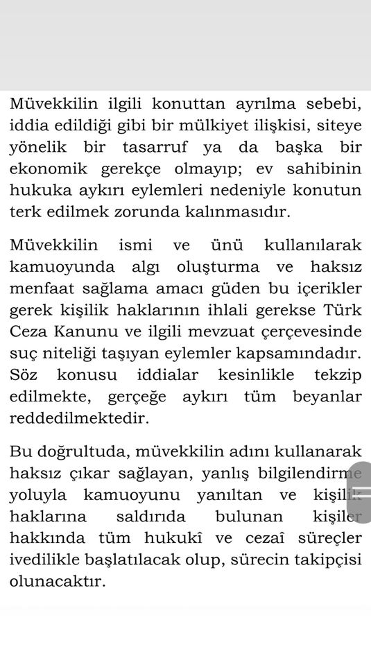 Müvekkilin ilgili konuttan ayrılma sebebi, iddia edildiği gibi bir mülkiyet ilişkisi, siteye yönelik bir tasarruf ya da başka bir ekonomik gerekçe olmayıp; ev sahibinin hukuka aykırı eylemleri nedeniyle konutun terk edilmek zorunda kalınmasıdır. Müvekkilin ismi ve ünü kullanılarak kamuoyunda algı oluşturma ve haksız menfaat sağlama amacı güden bu içerikler gerek kişilik haklarının ihlali gerekse Türk Ceza Kanunu ve ilgili mevzuat çerçevesinde suç niteliği taşıyan eylemler kapsamındadır. Söz konusu iddialar kesinlikle tekzip edilmekte, gerçeğe aykırı tüm beyanlar reddedilmektedir. Bu doğrultuda, müvekkilin adını kullanarak haksız çıkar sağlayan, yanlış bilgilendirme yoluyla kamuoyunu yanıltan ve kişiler haklarına saldırıda bulunan kişiler hakkında tüm hukukî ve cezaî süreçler ivedilikle başlatılacak olup, sürecin takipçisi olunacaktır.