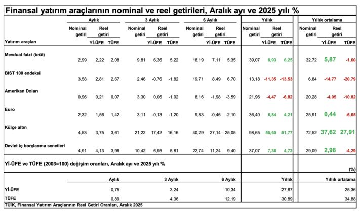 TÜİK’in yayımladığı finansal yatırım araçlarının nominal ve reel getirilerine bakıldığında, manşeti belirleyen sütun en sağda duruyor: yıllık ortalama. Çünkü kısa vadeli sıçramaların, dönemsel oynaklıkların değil; bir yıl boyunca paranın başına ne geldiğinin muhasebesi orada tutuluyor.