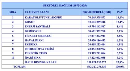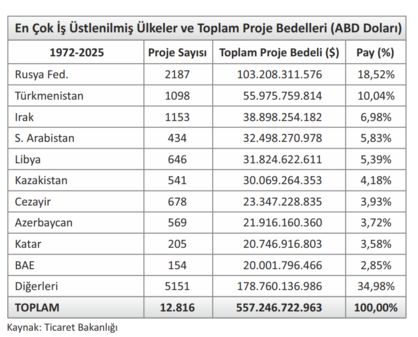 Türkiye’nin müteahhitleri dünyada iyi tanınıyor. Dünyanın en büyük 250 müteahhidi listesine her yıl 40-45 şirketimiz yer alıyor. 2025 ödülleri daha yeni verildi. 1972’den bugüne kadar 138 ülkede 557 milyar dolarlık 12.816 proje üstlenildi. Rakamlar bugünkü dolar değerine getirilse muhtemelen bir trilyon doları geçer.