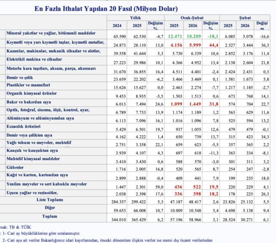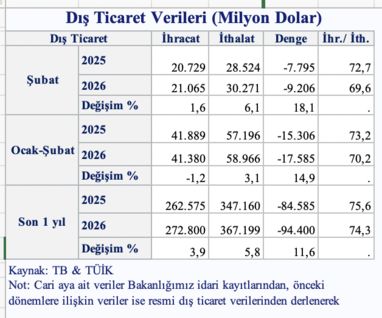 Türkiye ekonomisi 2026’nın ilk iki ayını dış ticarette karmaşık sinyallerle kapatıyor. Yılın ilk iki ayında ihracat yüzde 1.2 düşerken ithalat yüzde 3.1 arttı. Son bir yılda ise ihracat artışı yüzde 3.9, ithalat artışı yüzde 5.8 oldu. Uygulanan dezenflasyon programı ile büyümenin düşürülmesine rağmen ithalat önde gidiyor.