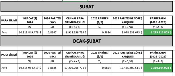 İhracat tarafında ciddi bir tıkanıklık söz konusu. En çarpıcı detay ise bu durağanlığın yılın ilk iki ayında 2,35 milyar dolarlık devasa bir parite desteğine rağmen gerçekleşmiş olmasıdır. Eğer Euro/dolar paritesi bu denli lehimize olmasaydı, ihracat rakamlarında yüzde 6.8 ile çok daha sert bir düşüşü konuşuyor olabilirdik.