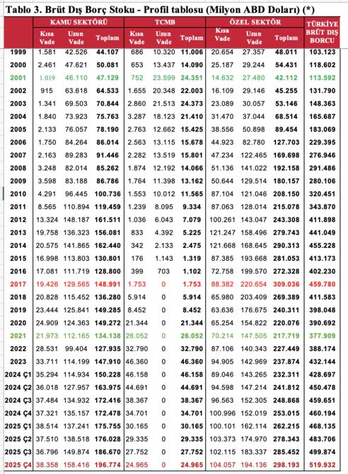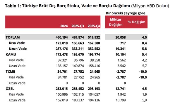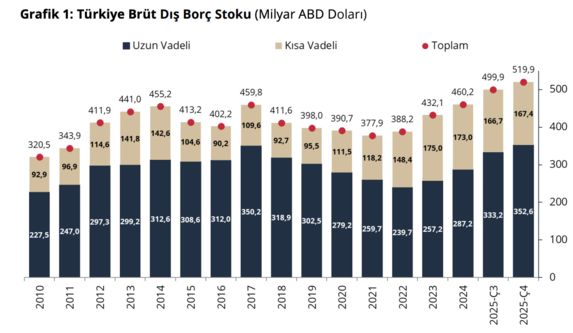 Türkiye ekonomisi, kağıt üzerinde "milli gelire oran" bazında %32.5 ile hala yönetilebilir görünen ancak derinliklerine inildiğinde ciddi yapısal çatlaklar barındıran tarihi bir borç eşiğinde. Açıklanan son verilerle birlikte Türkiye’nin brüt dış borç stoku ilk kez psikolojik sınırı aşarak 519,9 milyar dolara ulaştı. Sadece son bir yılda üzerine eklenen 60 milyar dolar, dış finansman ihtiyacının ne denli kemikleştiğini gösteriyor.